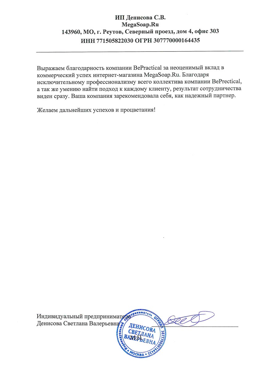 «Благодаря студии «Практик» мы увидели отдачу от Интернет. У нас был сайт, но заниматься им не хватало времени. Предложение по аренде сайта оказалолсь идеальным решением для нас, т.к. при такой схеме работы мы оцениваем результат только по количеству звонков, и, что происходит с сайтом, для нас не важно, главное результат, которым мы довольны. Спасибо студии «Практик»!»
